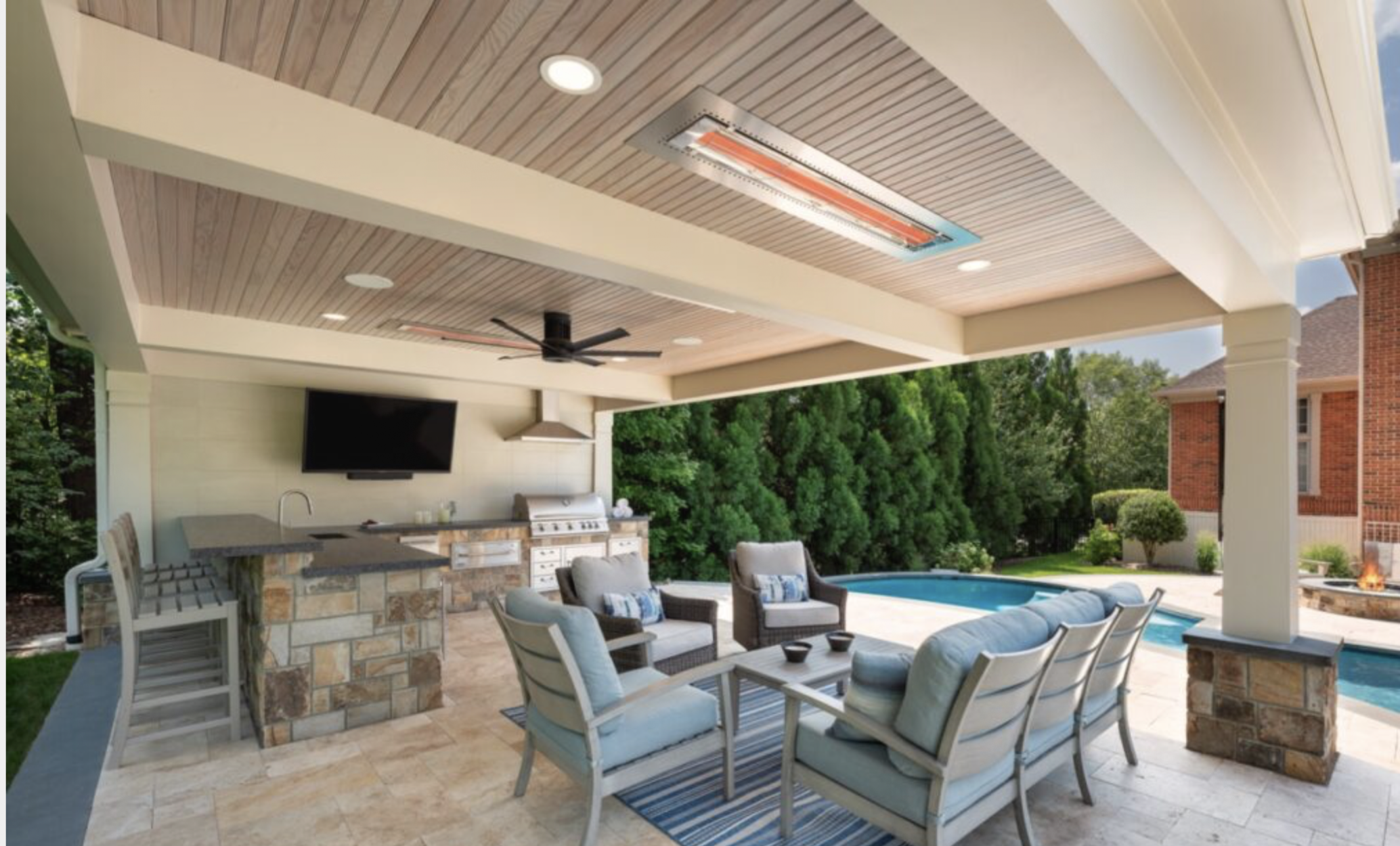 Multiple mounting options including ceiling mount, flush mount, and post-mount for versatile installation. Flush-mount models create a sleek, low-profile appearance with only the heater face visible.